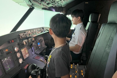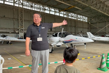 次に、崇城大学航空学部の駐機場に移動しました。大学の先生と生徒が、四人乗りの小型飛行機を紹介してくれて、間近で見学しました。ボーイング737-800の模擬コックピットで飛行体験も行いました。その後、航空機整備場で航空機整備関連学科の先生と生徒が小型航空機の様々な部位や航空機の機械知識を紹介してくれました。