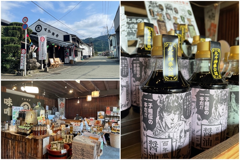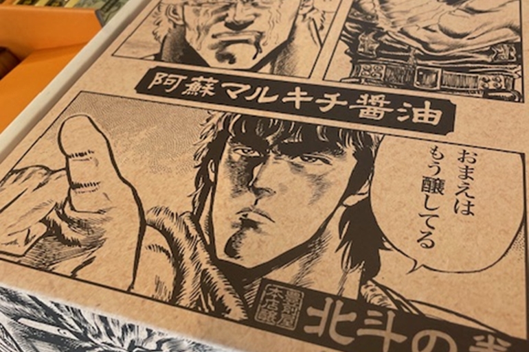 また店舗には、不朽の名作漫画「北斗の拳」とコラボした遊び心のある商品も並びます。醤油のラベルやギフトボックスに描かれた名場面の吹き出しに注目。ケンシロウやラオウが放つマルキチ醤油バージョンのセリフは必見です。