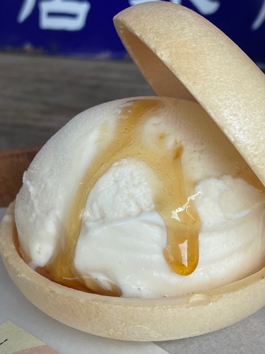 醬油冰淇淋是以阿蘇小國 Jersey 牛奶製成的香草冰淇淋為基底,再拌入特製的醬油蜜。「醬油最中冰淇淋」強調現點現做,點餐後才會把冰淇淋夾進最中餅殼裡,最後再淋上香甜濃郁的醬油蜜。從第一口到最後一口,都能吃到最中餅殼的香酥口感,搭配綿密冰淇淋與醬油蜜的濃厚層次,越吃越涮嘴。