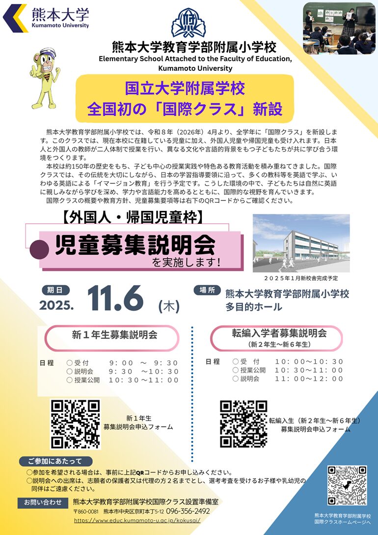 『熊本大学教育学部附属小学校に国立大学付属学校初の国際クラス』