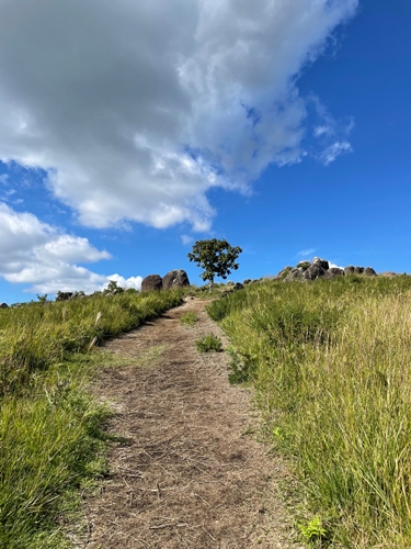 沿著緩緩上坡步行不久,眼前便展開一片令人心曠神怡的壯麗景色。丘陵上散落著許多巨石,