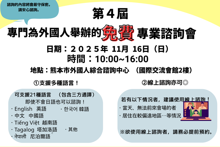 熊本市外國人綜合諮詢中心將舉辦「 第四屆 專門為外國人舉辦的免費專業諮詢會」。