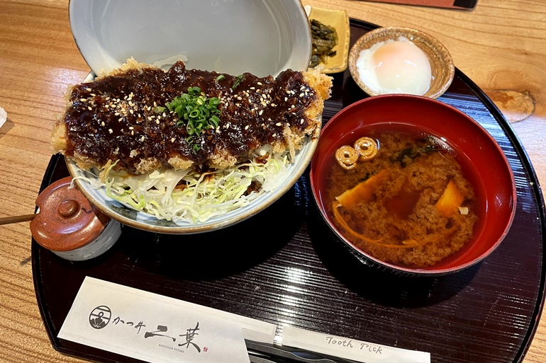 第三次的話則一定要試試「味噌豬排丼」!白飯上鋪滿清脆的高麗菜絲,再疊上現炸豬排,最後淋上香濃的味噌醬汁。吃之前再加上滑順的溫泉蛋。味噌的濃郁鹹香、與蛋的柔滑以及豬肉的香甜完美融合,真是人間美味!