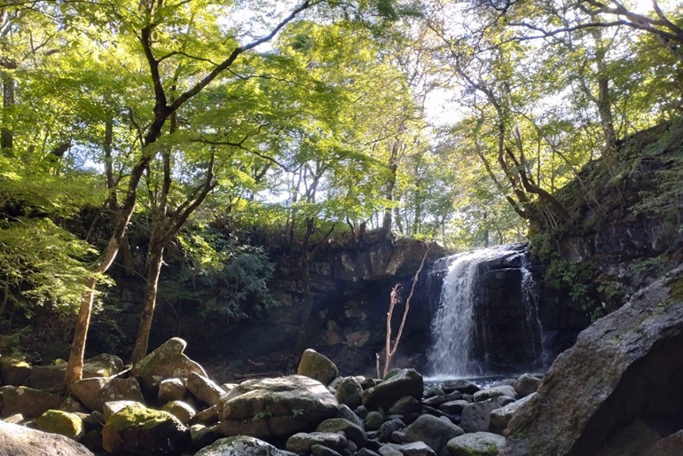 マゼノ渓谷は間瀬野牧野共有組合の所有。標高約700㍍の筑後川源流域で、普段は立ち入ることができないエリアですが、ゴールデンウイークと紅葉シーズンだけ「一般の人に楽しんでほしい」と公開しています。車で行くなら阿蘇のミルクロードからマゼノミステリーロードに入り、しばらく走ると右手に渓谷入り口の看板が見えてきます。広い駐車場を降り、原生林やクヌギ林の中をしばらく歩くと、渓谷へ降りる道へ。圧巻は、マゼノ滝の滝壺周辺。巨岩がゴロゴロ、巨木が空を覆い隠くしています。滝の落ちる音、清流の流れ、野鳥の声に癒されます。しばらく、この絶景をぼーと眺めていました。