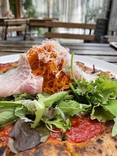 「堀川スペシャル」は、自家製キャロットラペが山盛り! 薪窯で焼き上げたマルゲリータと相性抜群で、女性でもペロリと完食できちゃいます。