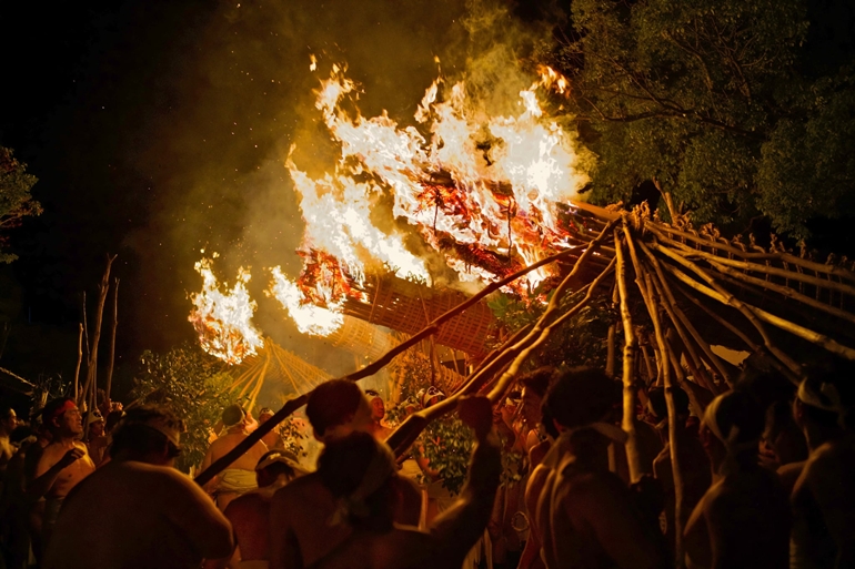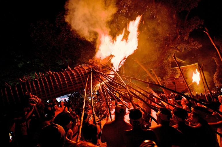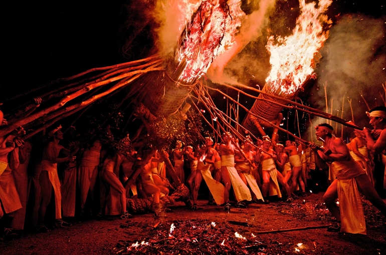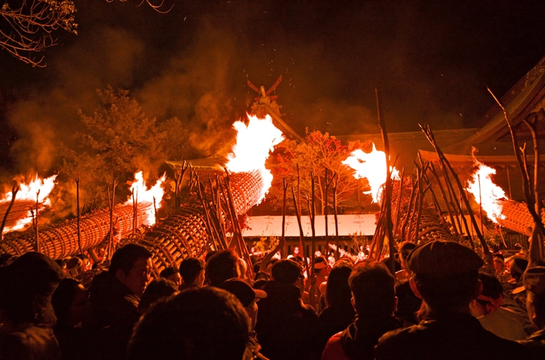 日本一といわれる大松明6本が紅蓮の炎を上げて燃え盛り、それを数百人の裸の氏子若衆がカリマタで支えて境内を廻るという熱気あふれる勇敢な年頭の祭りです。