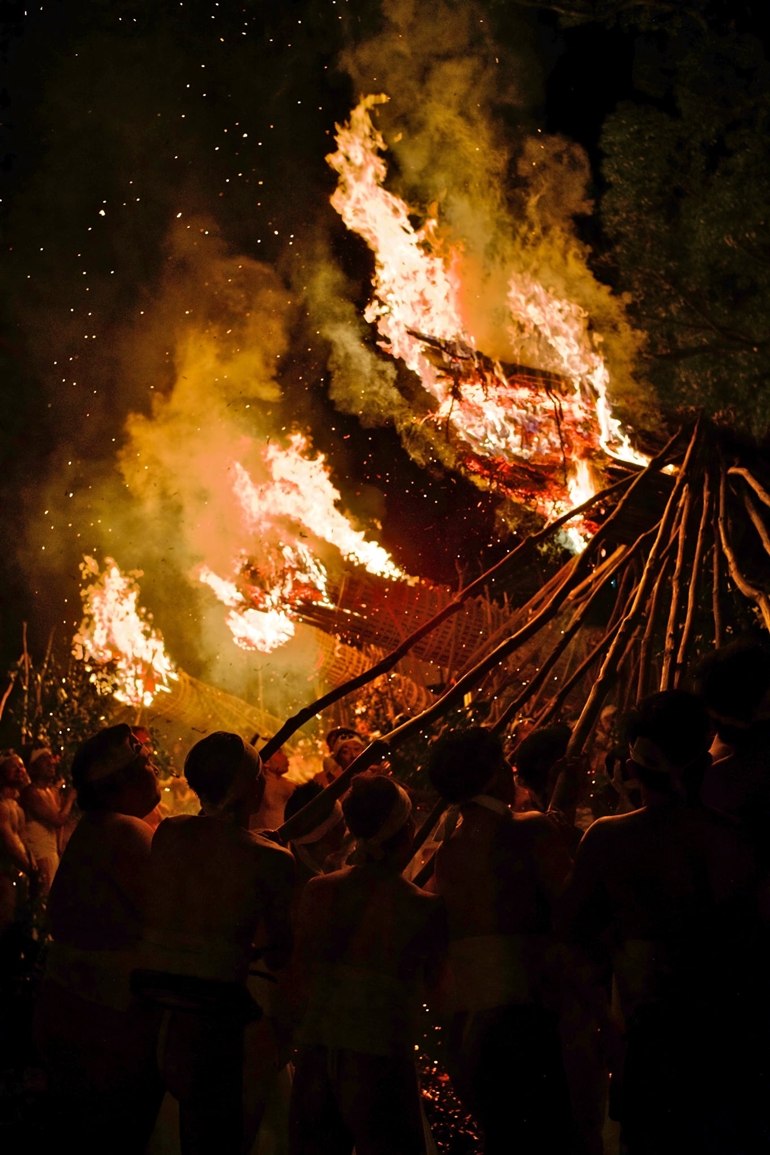 日本一といわれる大松明6本が紅蓮の炎を上げて燃え盛り、それを数百人の裸の氏子若衆がカリマタで支えて境内を廻るという熱気あふれる勇敢な年頭の祭りです。