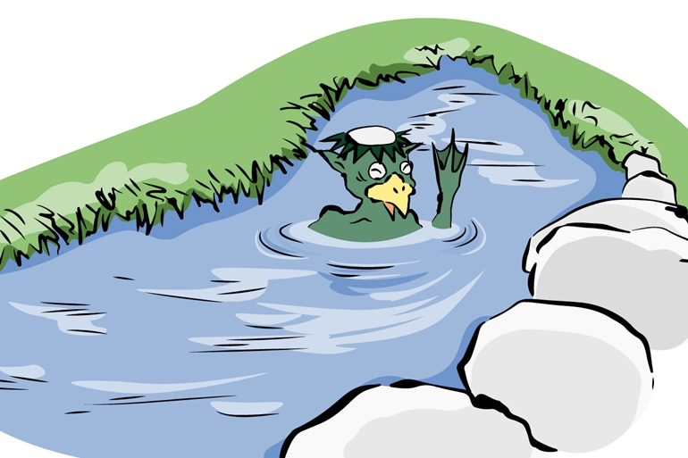 日本の代表的な妖怪・河童。水辺にすみ、キュウリが大好物で、いたずら好き。頭にお皿を載せた姿に愛嬌があり、民話や伝説にも数多く登場します。