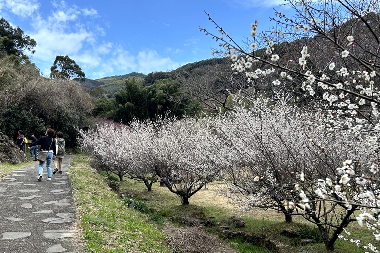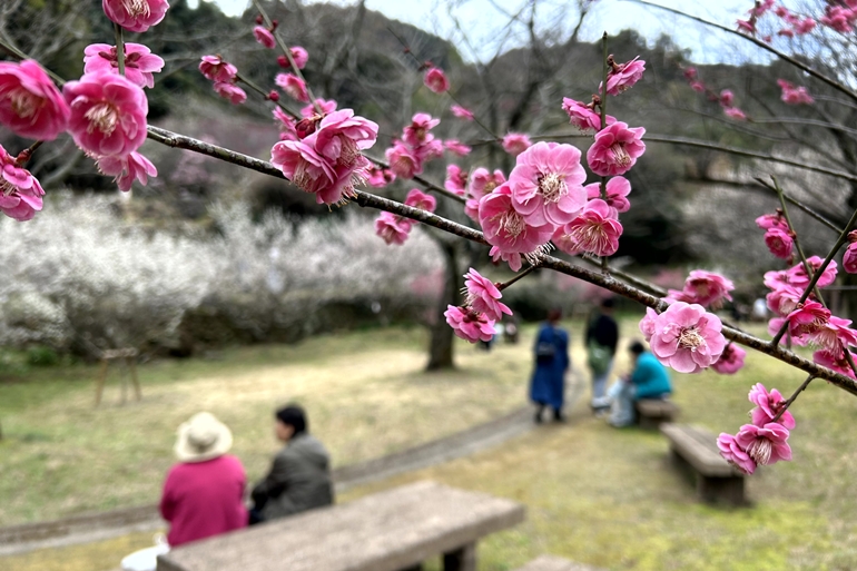 園内を周回する歩道はほんのり梅の香りが漂う穏やかな空間です。数ヶ所にベンチや休憩スペースが設けられているので、そこでお弁当を広げるのもいいですね。