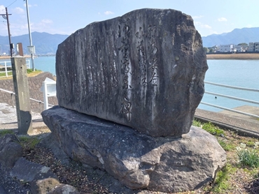 河童像のすぐ近く。球磨川の土手を上った所に古い石碑がありました。石碑には、「河童渡来之碑」と書かれていました。ここは1600年以上前、九千匹の河童が中国の揚子江から東シナ海を泳ぎ渡り、すみ着いた場所だそうです。九千匹の河童の大群がこの川から上がってきたなんて、想像するだけで怖くなりますね。